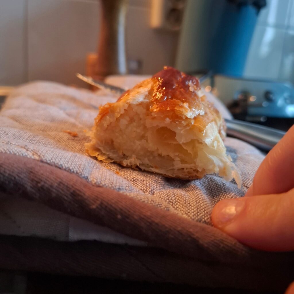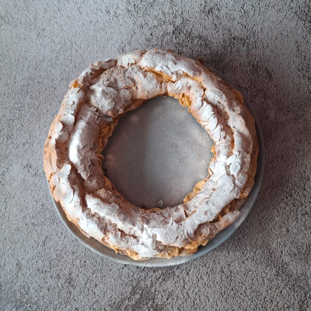 De Paris-Brest. Een soes in de vorm van een krans, doormidden gesneden met daarin een vulling. Het is
