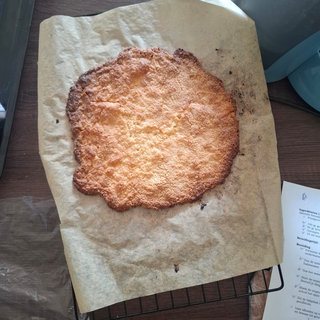Deze laag bestaat uit amandelspijs wat je in een cirkel uitrolt (en dus deze keer weer eentje van 20 cm doorsnede, maar ik had hetzelfde probleem als met de koeklaag, dus werd het weer 21) en in de oven bakt.