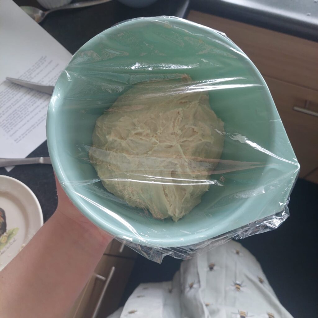 Ik legde het deeg in een kom en dekte het af met plasticfolie. Het water uit de waterkoker goot ik in een ovenschaal, die ik op een bakplaat helemaal onder in de oven zette. Daar meteen boven plaatste ik het ovenrooster, waar ik de kom op zette.