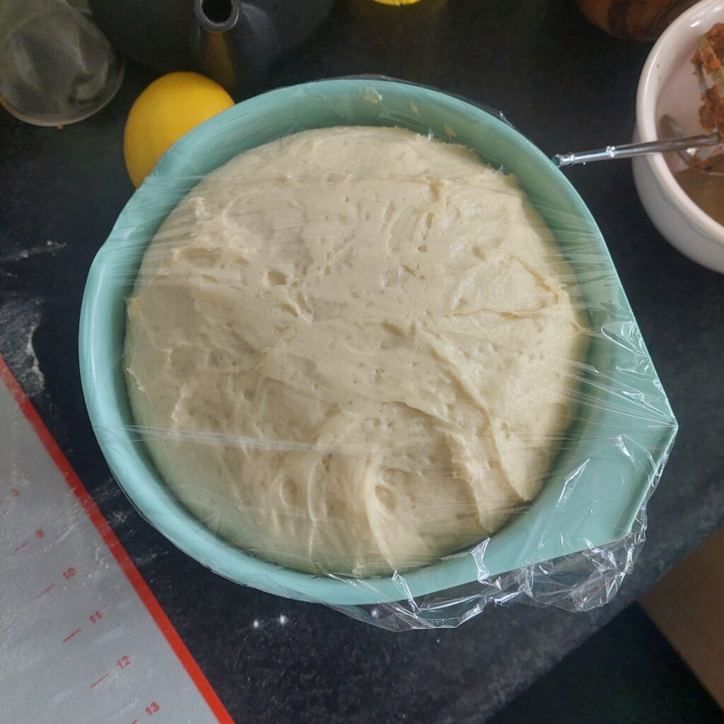 Het deeg was super plakkerig. Het moest een soepel deeg zijn, maar wat hield dat precies in? Ik werkte bijna nooit met brooddeeg, dus ik had geen flauw idee hoe het moest voelen. Maar ik besloot dat het nu nog niet soepel was.