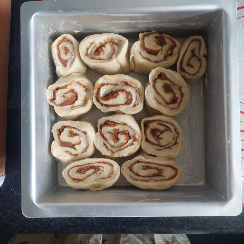 Dus de volgende fase van de cinnamon rolls kon beginnen. Ik maakte een vulling door boter, lichte basterdsuiker en kaneel bij elkaar te mixen en rolde het deeg uit op een licht bebloemd werkblad. Ik smeerde de vulling eroverheen en rolde het deeg op vanaf de lange zijde. Daarna sneed ik er 12 stukjes uit, die ik in een ingevette bakvorm deed.