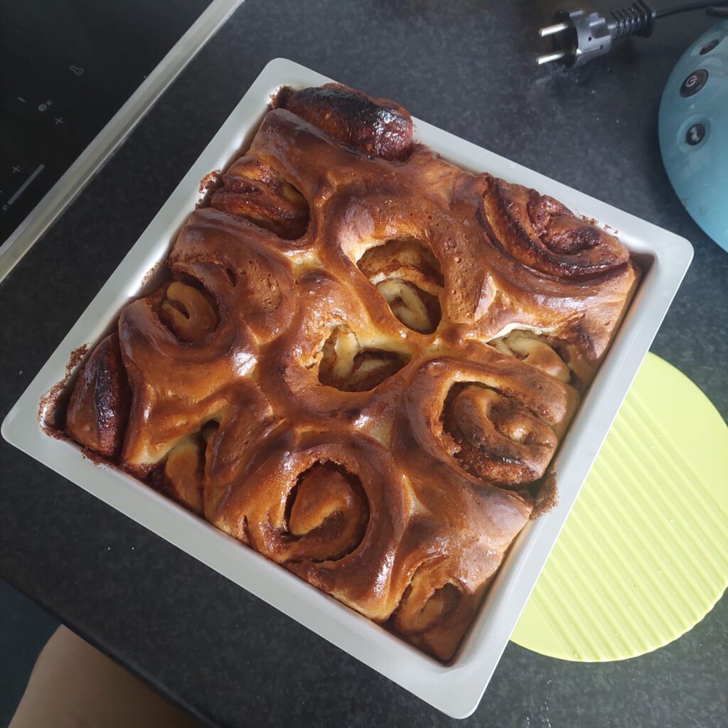 Ik deed weer warm water in de ovenschaal, dekte de bakvorm met de cinnamon rolls losjes af en zette hem in de oven, zodat hij nog een uurtje kon rijzen.
