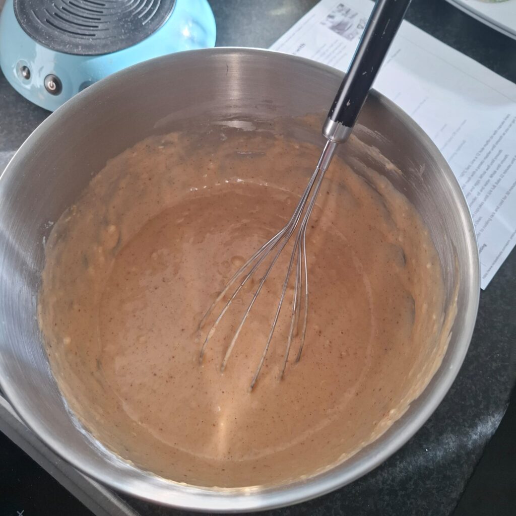 Als eerste stampte ik de bananen zo glad mogelijk, waarna ik met een garde de pindakaas, honing en eieren toevoegde en erdoorheen roerde. Daarna voegde ik het bloem, bakpoeder, olie en water toe.