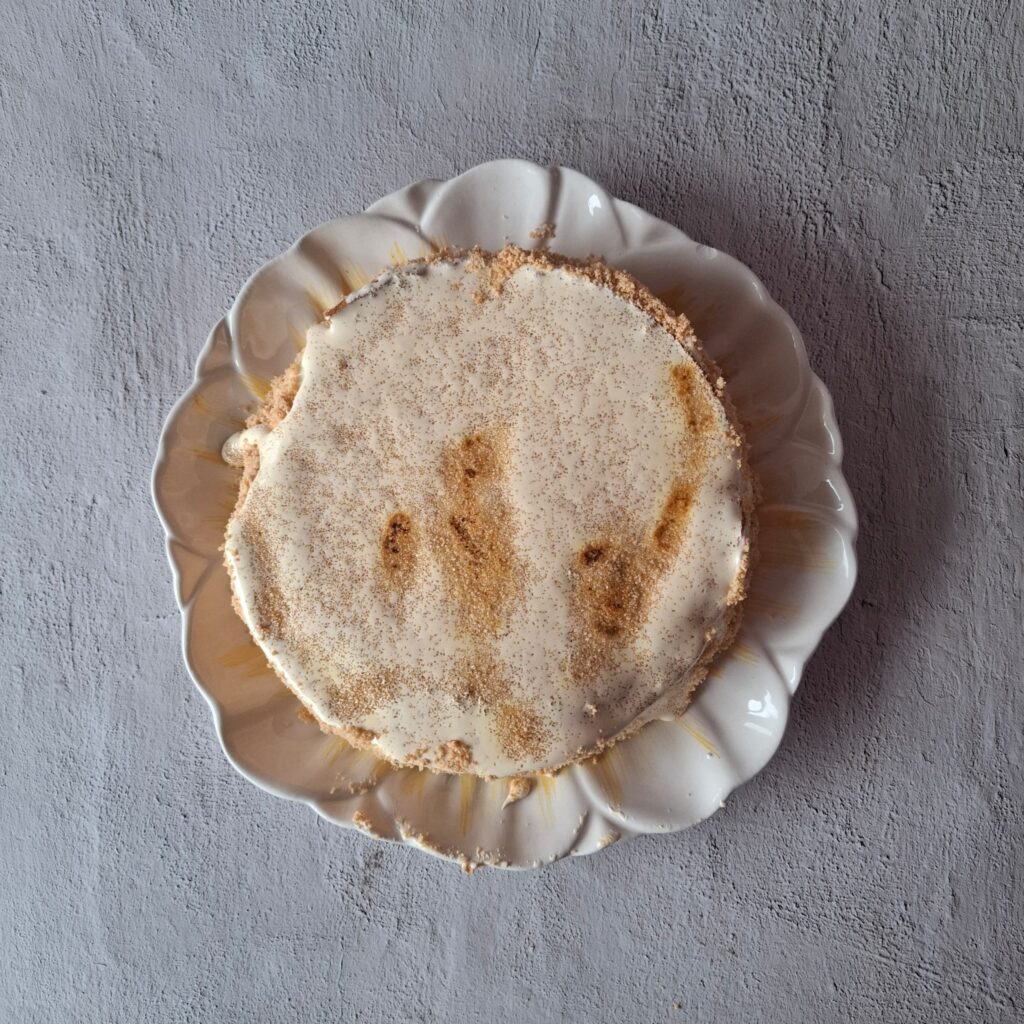 Ik drukte nog wat koekkruimels tegen de randen. Hierna moest ik wat rietsuiker over de taart strooien (er stond ‘een dun laagje’, maar wat is dat?) en dat met een crème-brûlée brander lichtelijk bruin branden.