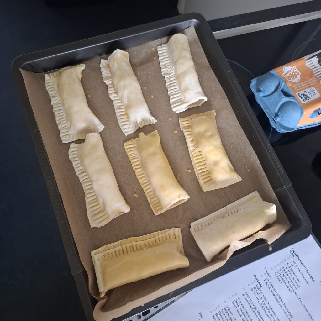 Twee bladerdeegplakjes waren erg droog en hierdoor niet bruikbaar, dus kon ik twee saucijzenbroodjes niet maken.