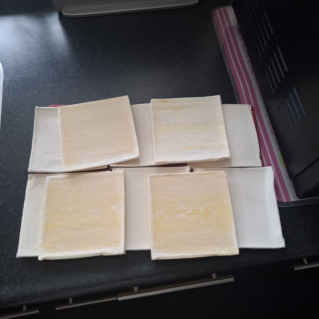 Allereerst moest het bladerdeeg ontdooien. Ik legde 10 plakjes op een snijplank en zette een timer van 15 minuten. Na die 15 minuten ging ik bezig met de vulling.