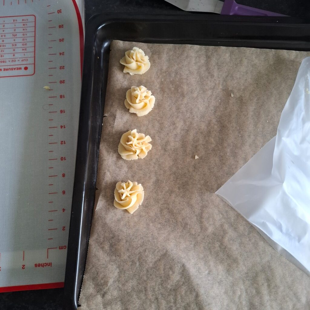 De vier rozetjes heb ik op de bakplaat gelegd en in de oven gezet, want iets was beter dan niets. Ik wist alleen dat ik dan wel ontzettend veel botercrème over zou hebben als dit letterlijk de enige koekjes waren die ik had.